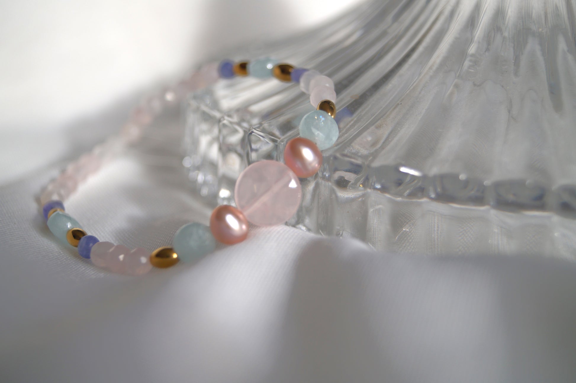 - Composition : Tanzanite, Quartz rose, Aigue Marine, Hématite, Perle de culture – Féérie, imagination et tendresse à foison