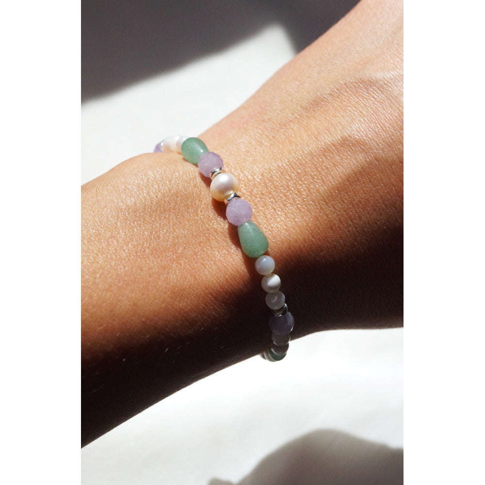Ce bracelet unique vous transportera dans l'univers aquatique de votre sirène favorite grâce à ses matériaux, références à la mer, et ses couleurs emblématiques: La perle de culture et la Nacre, alliées à la Jade et l''Aventurine apporteront douceur et élégance à votre poignet. Les pierres précieuses brilleront de mille feux aux côtés des perles ondulées d'Hématite.